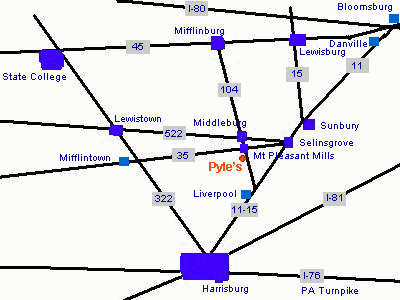 We are conveniently located on Rt. 104, 1/2 mile South of the Rt. 35 intersection, Mt. Pleasant Mills, Snyder County, PA.